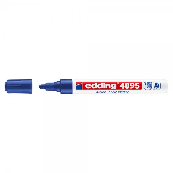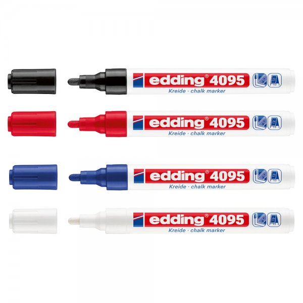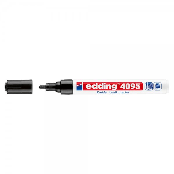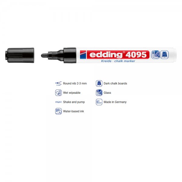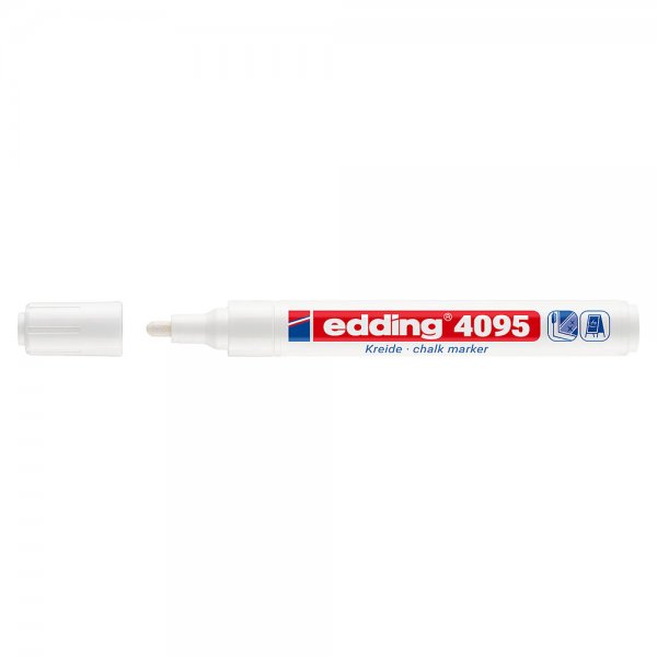 Понякога е трудно да се намери правилният инструмент за точни маркировки или текстове с тебешир. Не е така обаче с тебеширения маркер Edding 4095. Кръглият му връх освобождава силно непрозрачен течен тебешир, което позволява създаването на отличителни маркировки върху гладки повърхности като черни дъски, огледала и стъкло. Този маркер Edding е подходящ не само за креативно творчество у дома, но и е любим инструмент в бизнеси като ресторанти, барове или стъкларската промишленост.