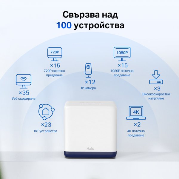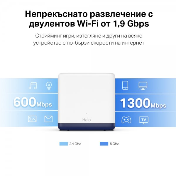 Други1.9 Gbps Dual Band Wi-Fi - Halo H50G осигурява бързи и стабилни връзки за над 100 устройства със скорост до 1900 Mbps и работи с големи доставчици на интернет услуги (ISP) и модеми